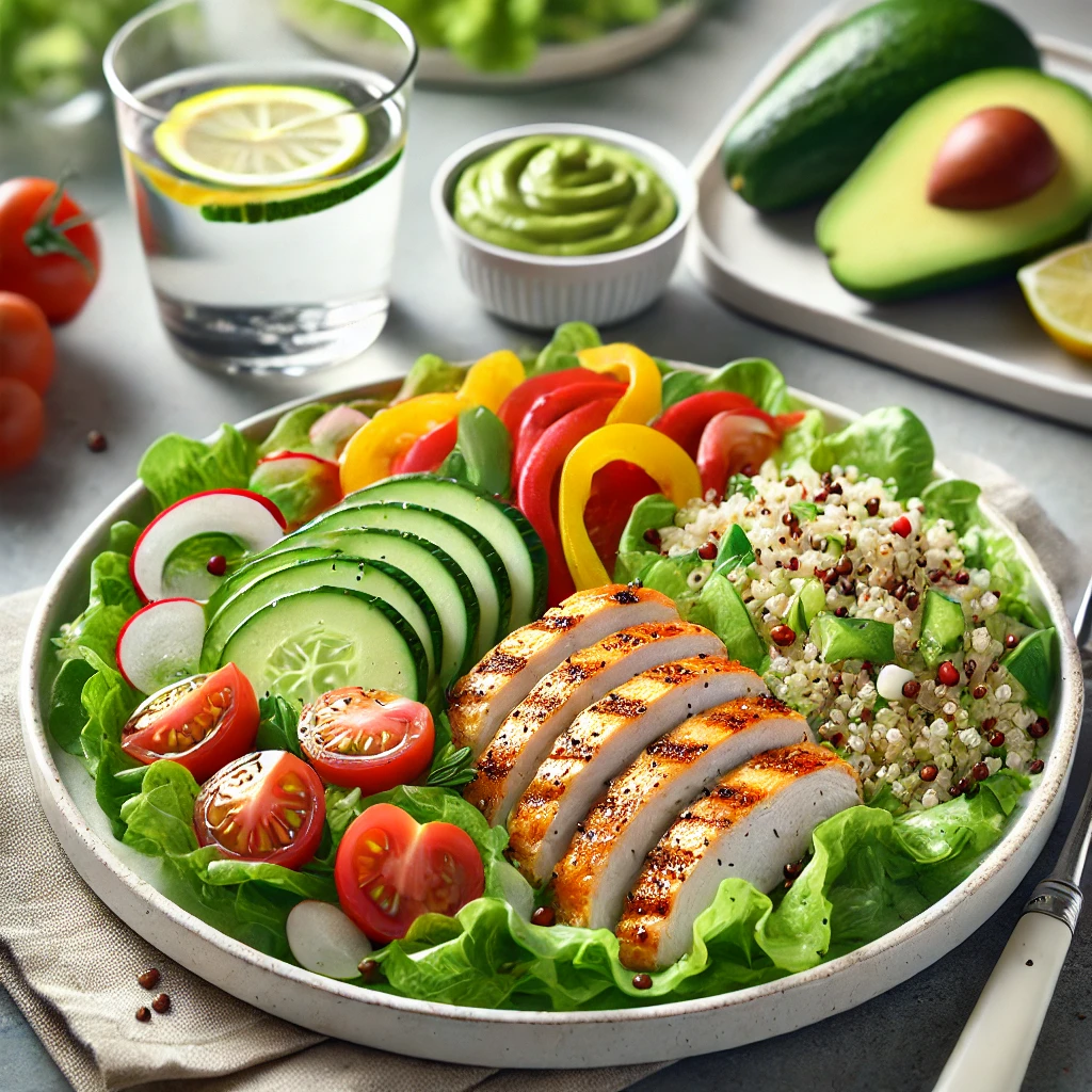 - 닭가슴살 샐러드: 구운 닭가슴살, 다양한 채소, 올리브유 드레싱을 곁들인 샐러드를 먹습니다. 이는 단백질과 비타민을 고르게 섭취할 수 있는 훌륭한 점심 식사입니다. 닭가슴살은 지방이 적고 단백질이 풍부하여 다이어트에 매우 적합합니다. 신선한 채소는 다양한 비타민과 미네랄을 제공하며, 올리브유 드레싱은 건강한 지방을 공급합니다. 샐러드에 색다른 채소를 추가하여 다양한 맛과 식감을 즐길 수 있습니다.